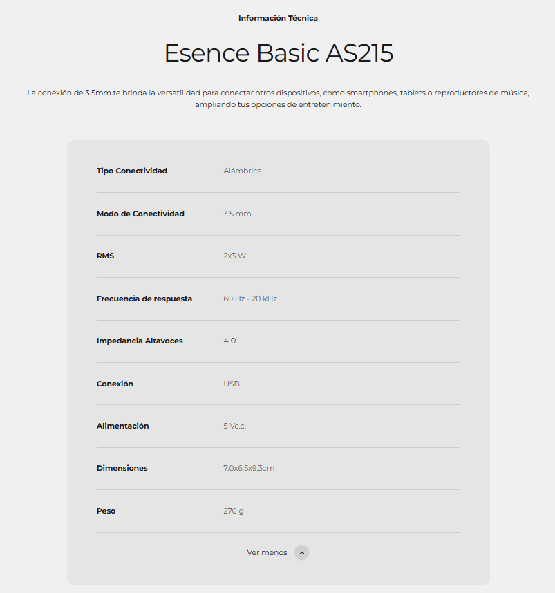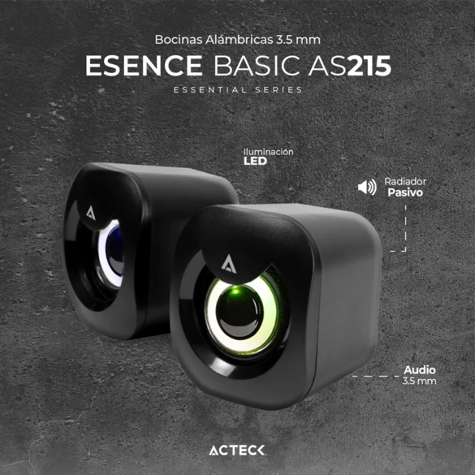Con una potencia de salida de 6W y alimentación a través de USB A, garantizan un sonido claro y nítido sin necesidad de una toma de corriente adicional. La conexión de 3.5 mm te permite conectar fácilmente tus dispositivos favoritos, mientras que el control de volumen integrado te brinda la flexibilidad de ajustar el nivel de audio según tus preferencias. Ya sea para trabajar o para disfrutar de tu música favorita, las Bocinas 2.0 Esence Basic AS215 ofrecen una experiencia auditiva de alta calidad en un paquete compacto.