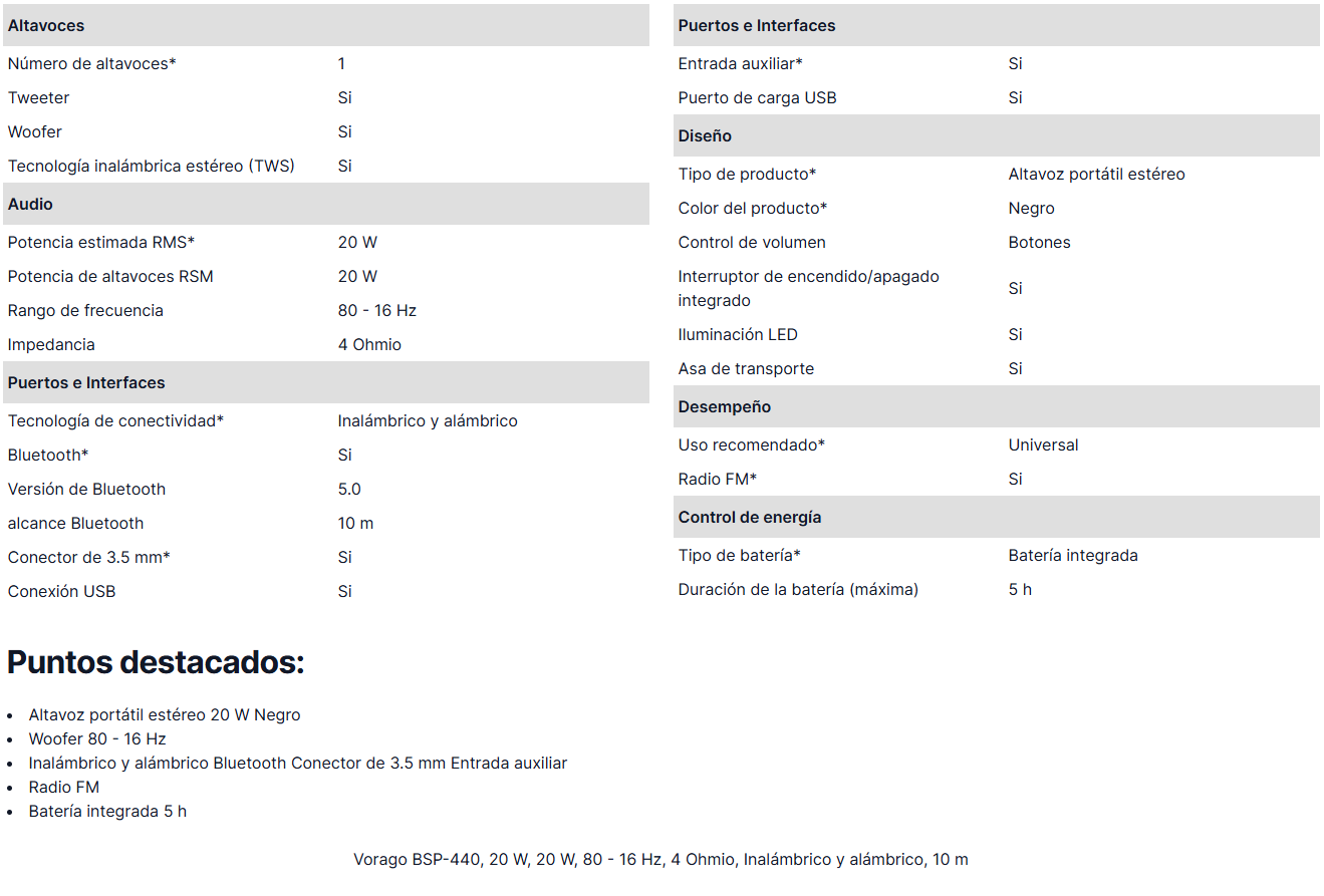 Vorago Bocina Portátil BSP-440, Bluetooth, Inalámbrico, 20W RMS, Negro