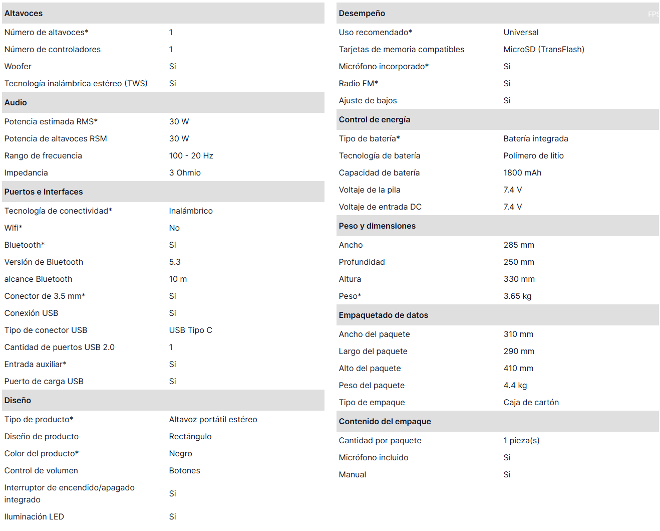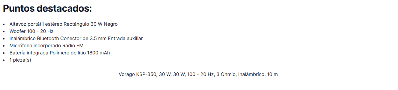 1. Vorago Bafle KSP-350, Bluetooth, Inalámbrico, 30W RMS, USB-C, Negro SKU: KSP-350