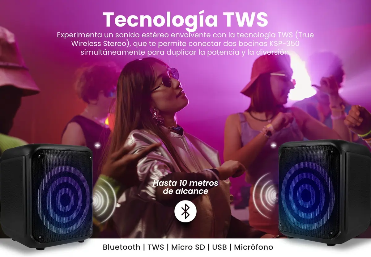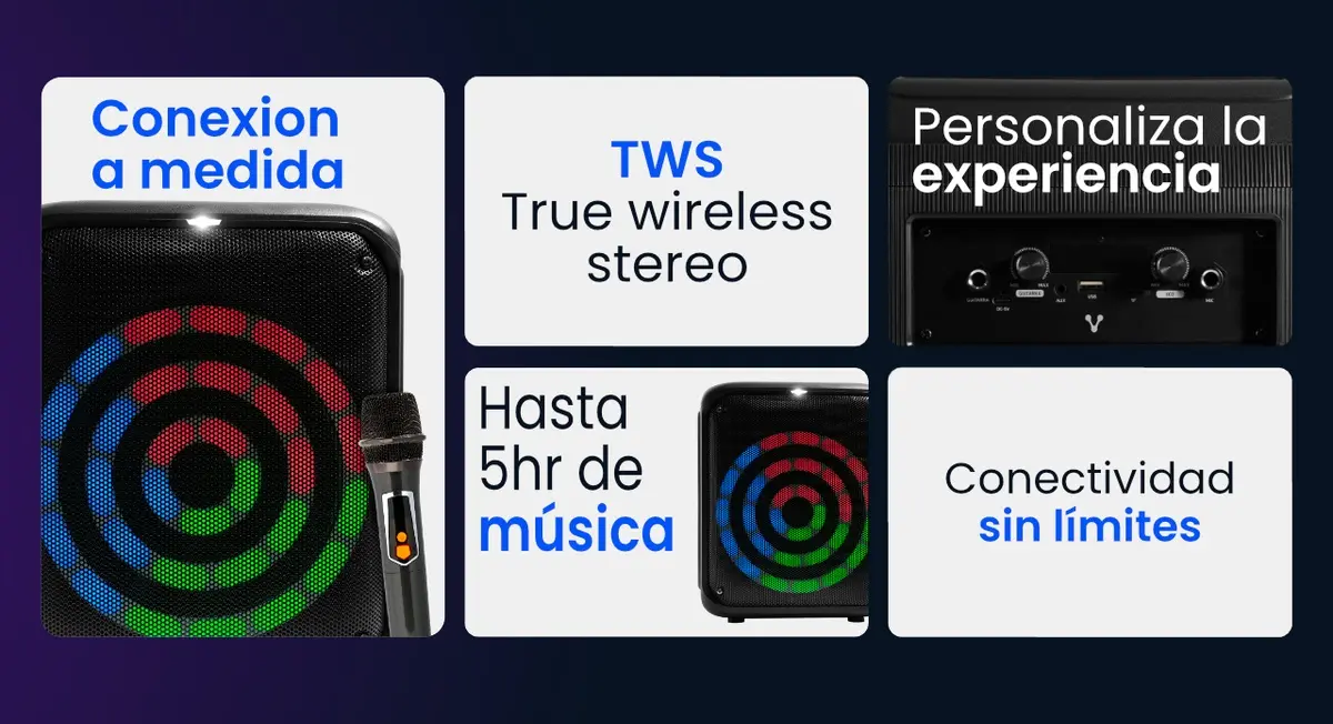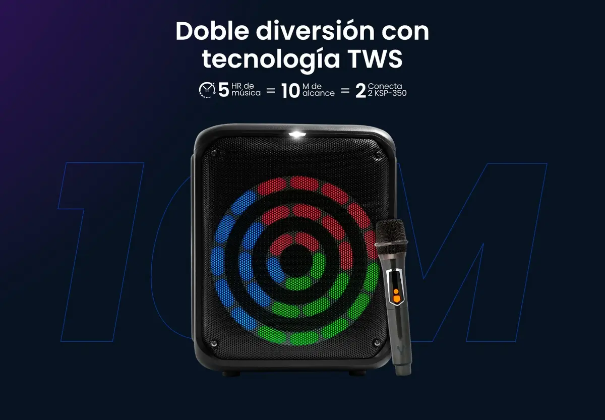 Vorago KSP-350 Bocina Bluetooth Bafle Karaoke 8 5 Hrs De Musica Microfono Recargable Inalambrico TWS USB C RGB Flash Disco Micro SD/3.5mm/USB-a