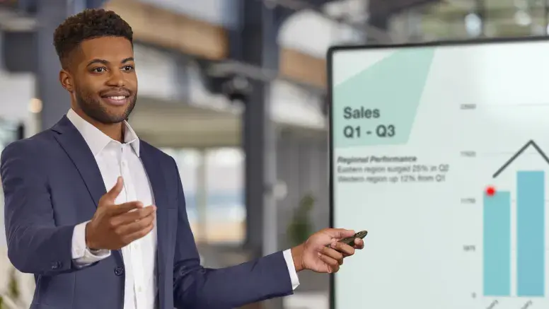 Realiza presentaciones impactantes con el remoto inalámbrico R500s para presentaciones. Muévete libremente y navega por las diapositivas a una distancia de hasta 20 metros de la pantalla, y señala las áreas relevantes con el puntero láser rojo.
