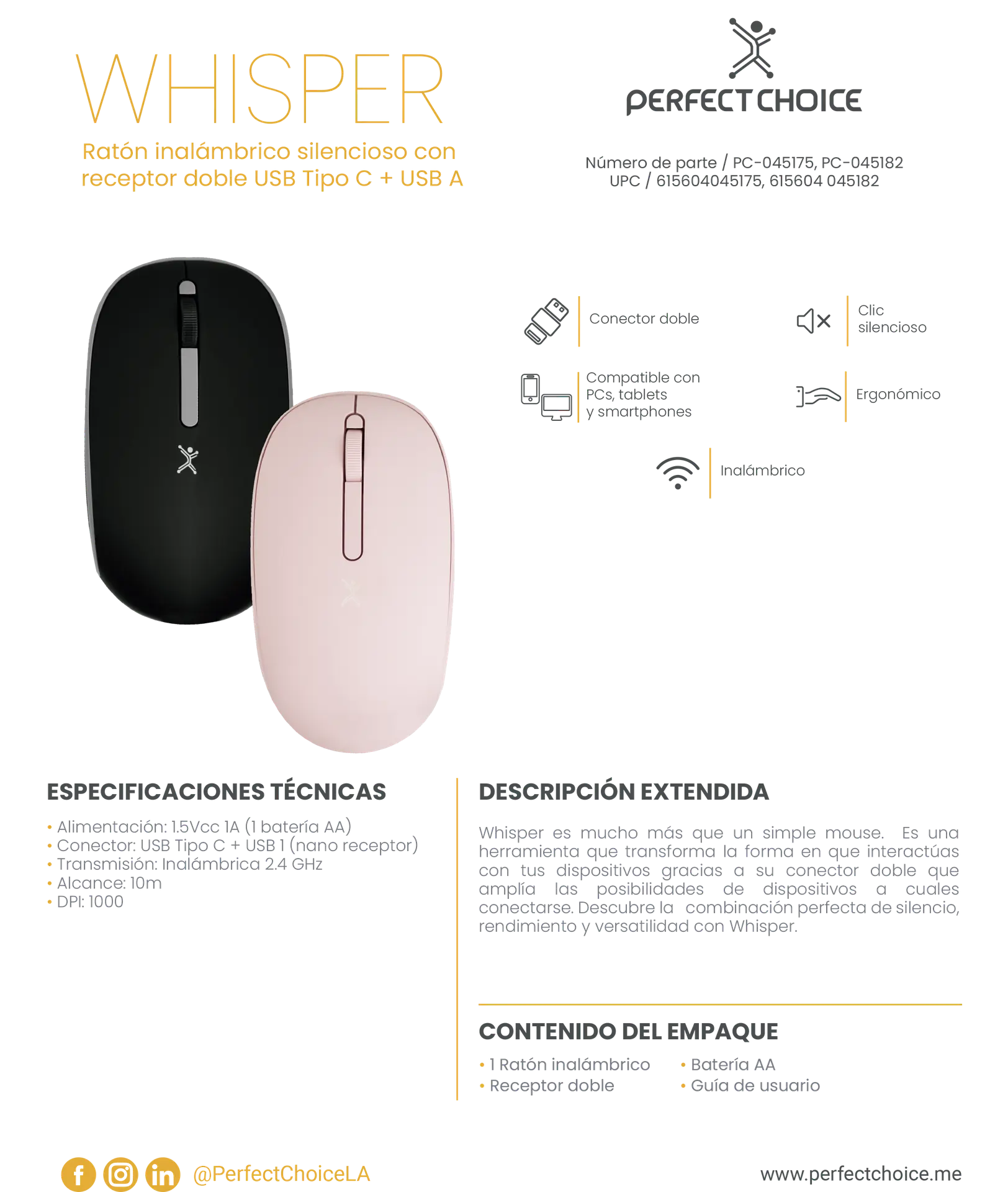 1. Mouse Perfect Choice Óptico Whisper, RF Inalámbrico, USB-C, 1000DPI, Rosa Doble Receptor, MS-1579 SKU: PC-045182