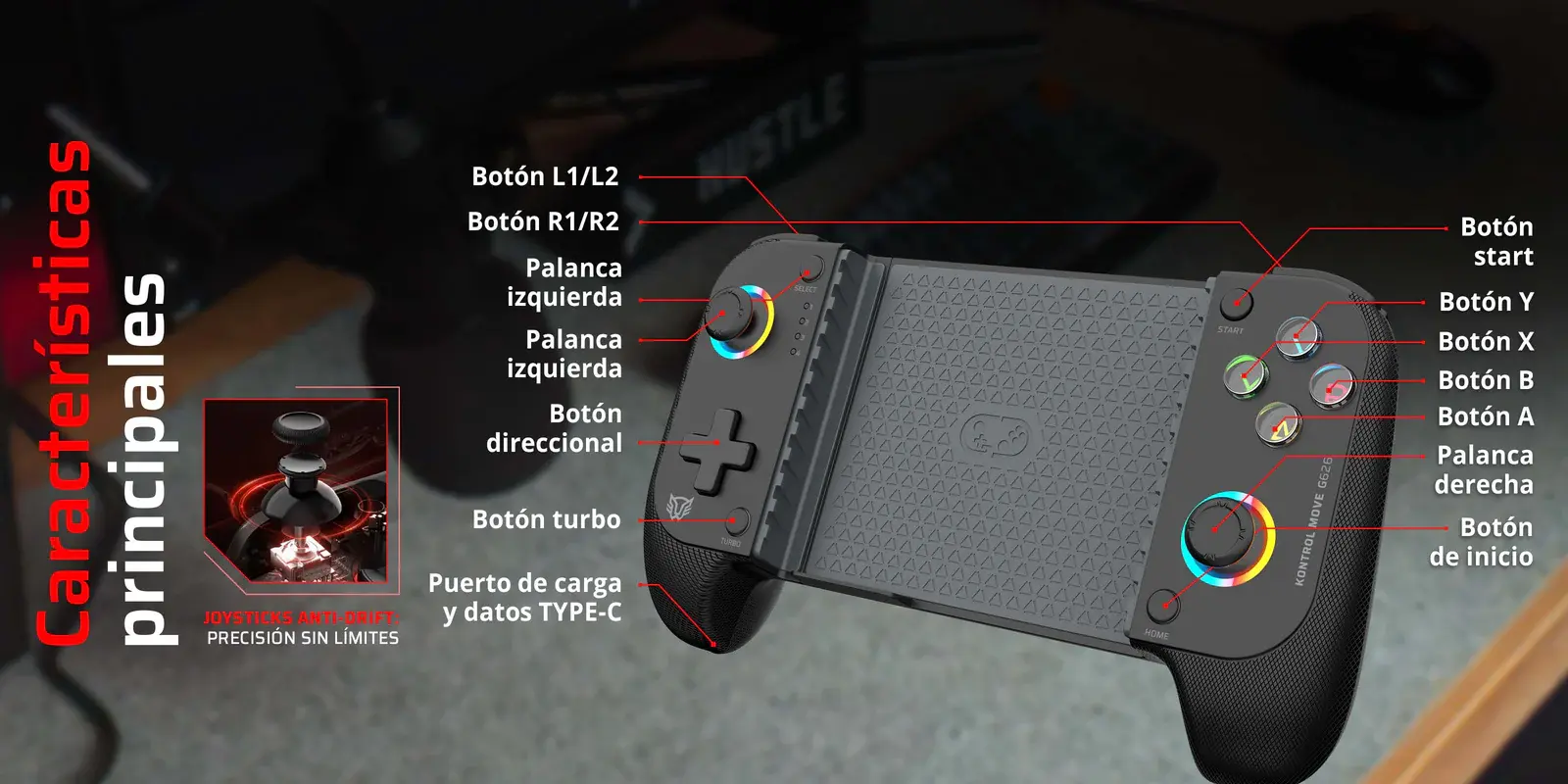 La iluminación RGB personalizable permite que el jugador ajuste los colores del joystick para adaptarse a su estilo o al ambiente de cada juego. Además de ser estético, aporta una experiencia visual dinámica que hace cada partida más atractiva.