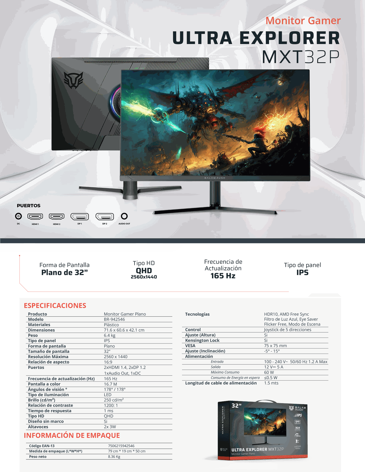 Monitor Gamer Balam Rush Ultra Explorer MXT32P LED 32", 2560x1440 Quad HD, G-Sync/FreeSync, 165Hz, HDMI, DisplayPort, Bocinas Integradas, Negro, 1ms, MNL-2876 SKU: BR-942546