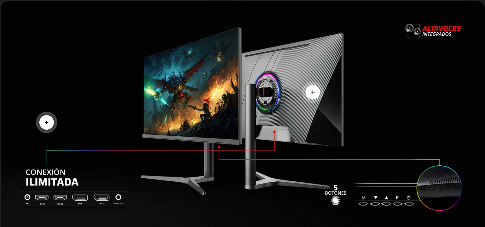 Monitor plano con panel IPS QHD, ideal para gaming y contenido multimedia. Su tasa de refresco de 165Hz y tiempo de respuesta de 1ms garantizan fluidez en cada partida. Disfruta de un sonido inmersivo con sus altavoces integrados de 3W y funciones avanzadas como PIP/PBP, HDR y Flicker-Free. Ajusta la altura para mayor comodidad y conecta fácilmente tus dispositivos con 2x HDMI 1.4, 1x DisplayPort 1.2, USB y salida de audio. Completa tu setup con iluminación RGB y soporte VESA 75mm.