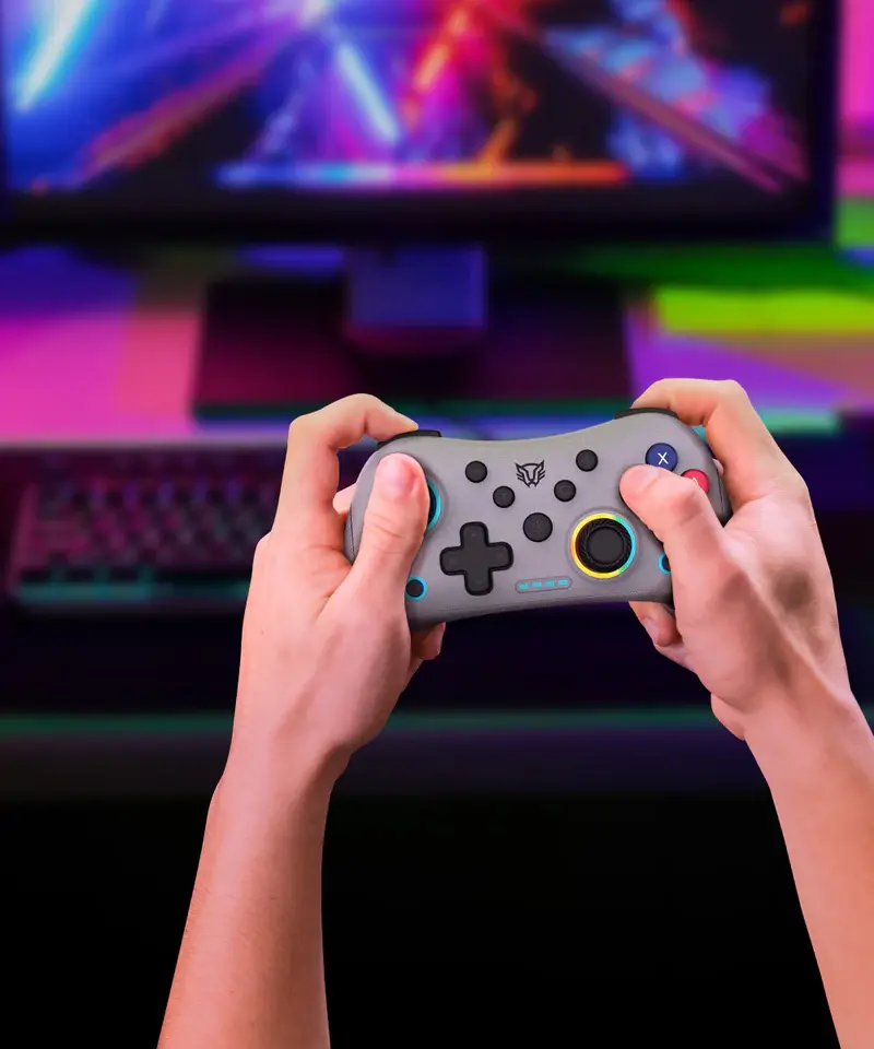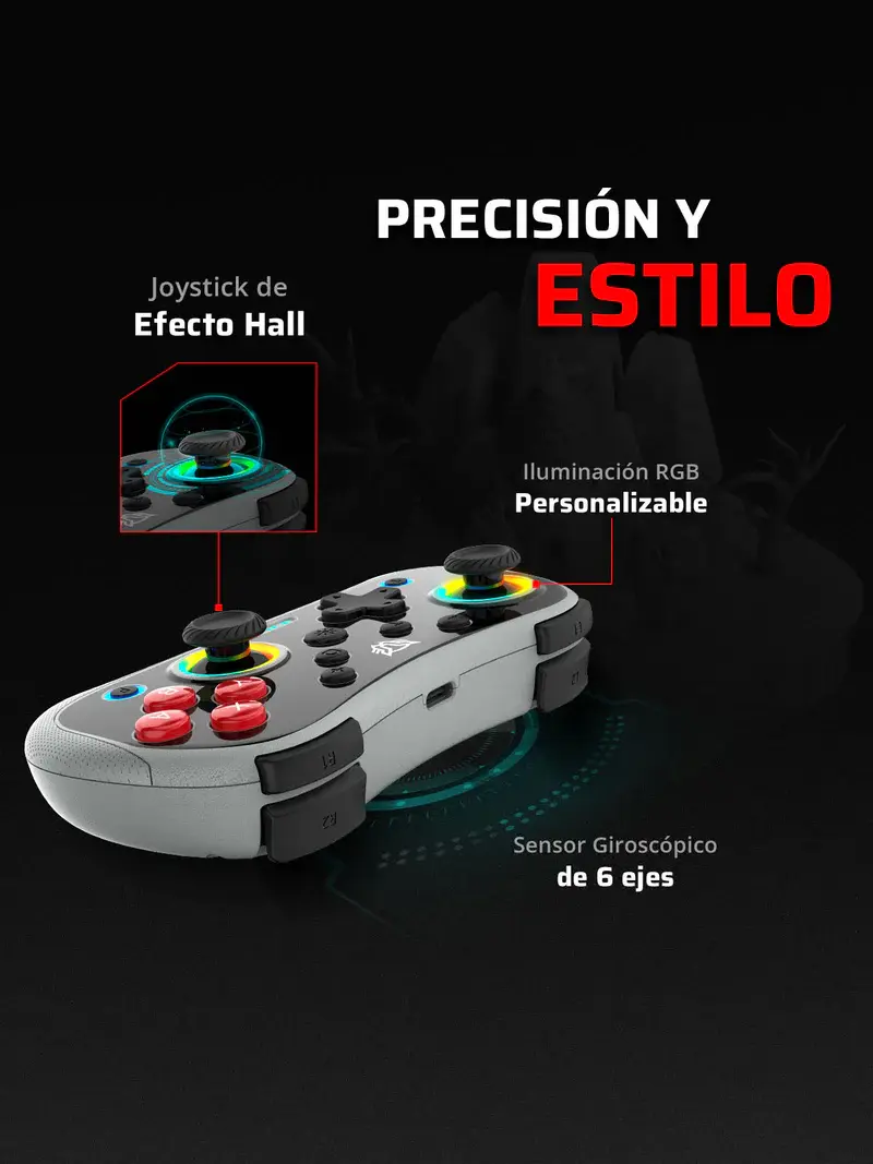 Joystick con efecto Hall para mayor precisión y durabilidad, iluminación RGB personalizable para un toque único, y sensor giroscópico de 6 ejes que responde a cada movimiento con total precisión. ¡Control total en tus manos!