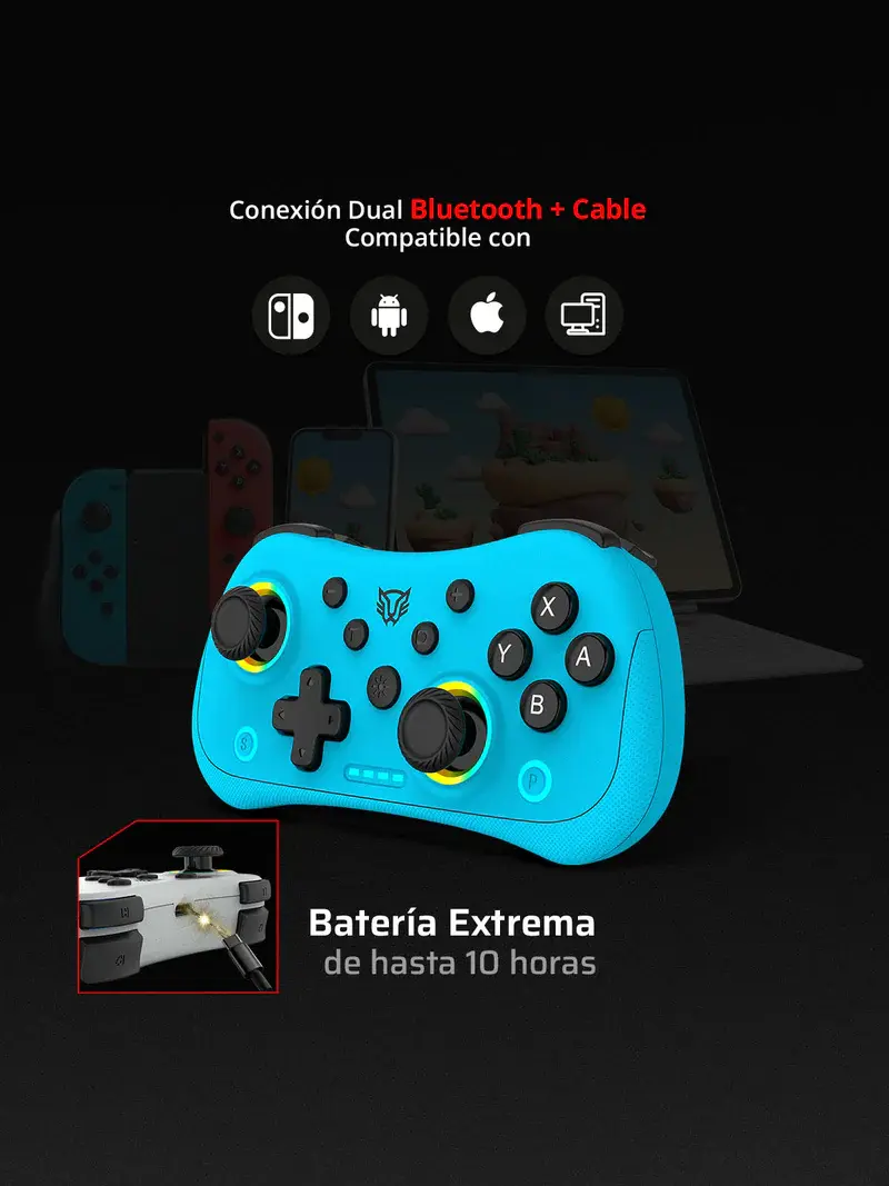 Compatible con Nintendo Switch, Android, iOS y PC (soporta X-Input y D-Input), y cuenta con conectividad dual: Bluetooth y cable. Además, su batería de larga duración te acompaña hasta por 10 horas seguidas. ¡Versatilidad y potencia sin límites!