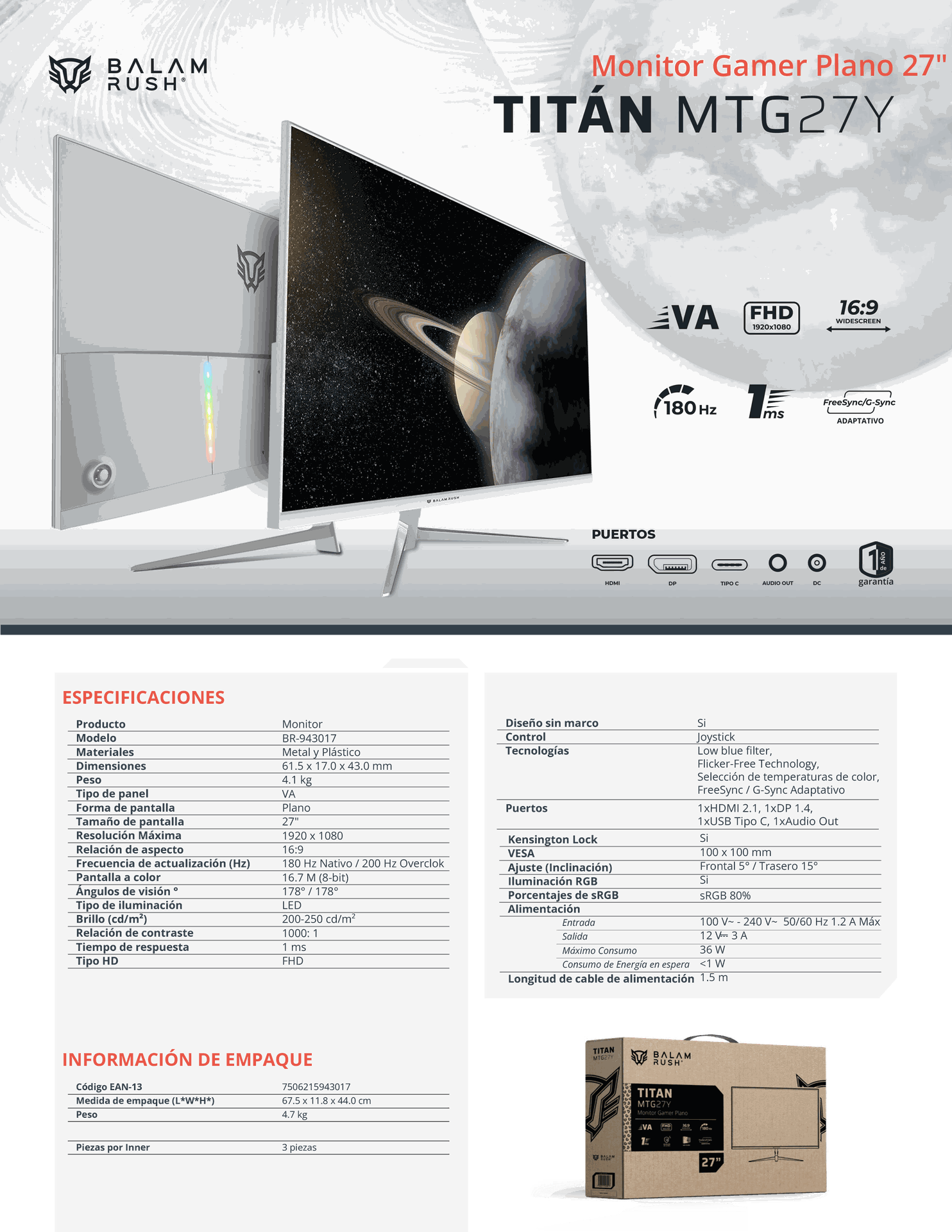 Monitor Gamer Balam Rush Titan MTG27Y LED 27", 1920x1080 Full HD, G-Sync/FreeSync, 180Hz, HDMI/DisplayPort, Blanco, MNL-2889 SKU: BR-943017