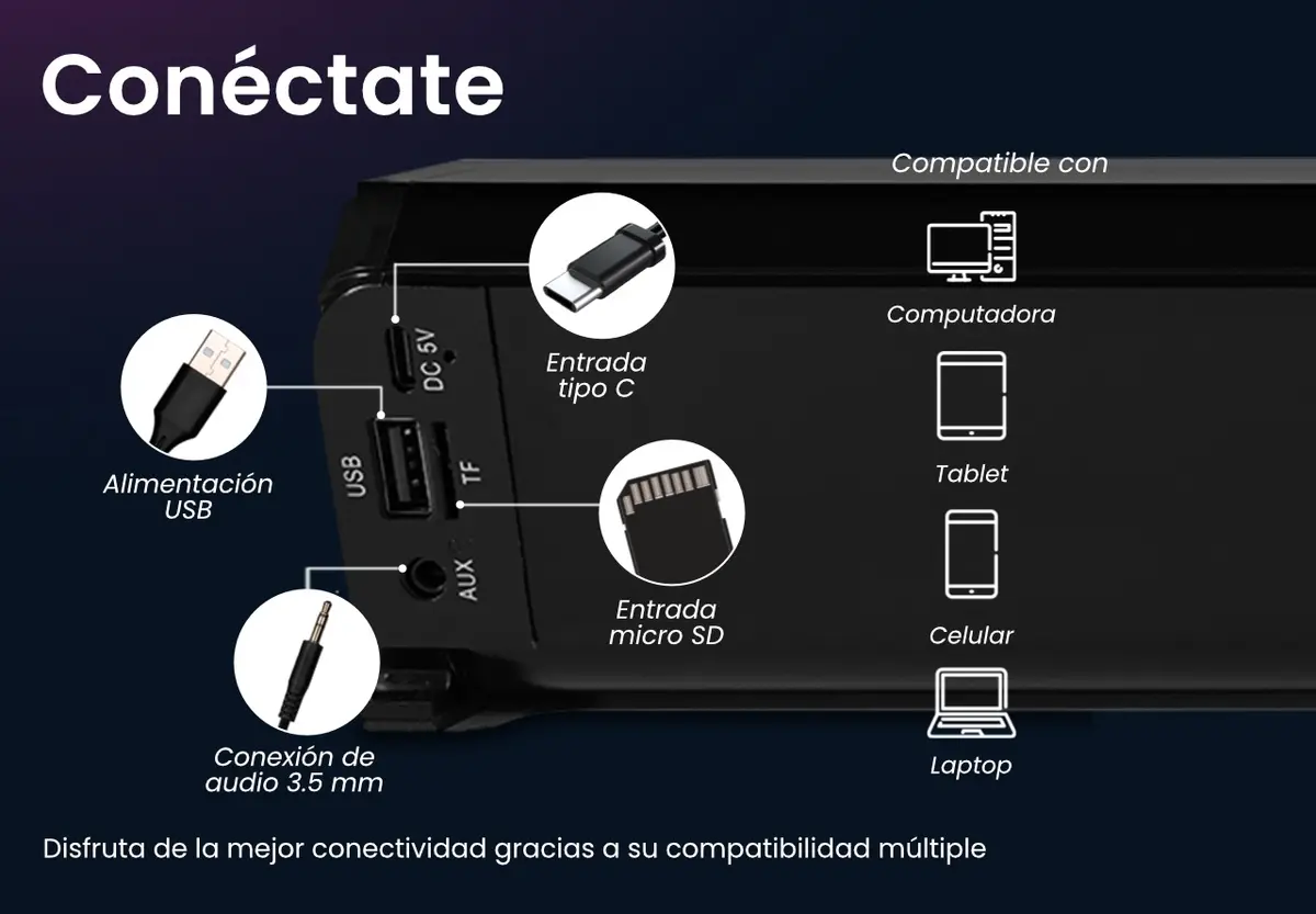 | Interfaz Bocina | Alimentación Usb o Auxiliar o Micro SD o Usb Tipo C |