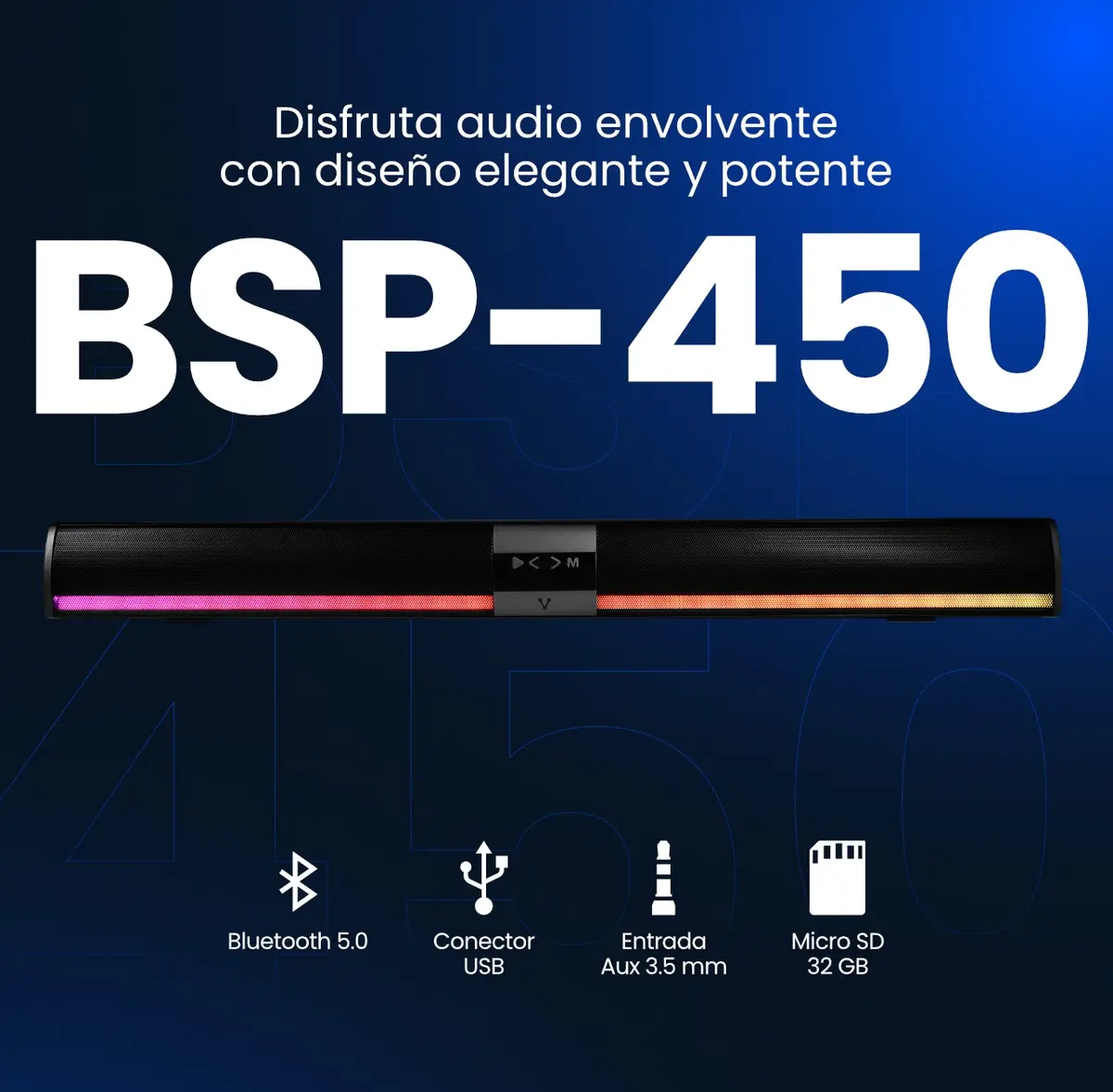 Renueva tu espacio con la bocina Bluetooth BSP-450 de Vorago, gracias a su diseño se adapta como un home teather para tu televisor o en tu setup para llevar el juego al siguiente nivel, ya que además cuenta con iluminación RGB.