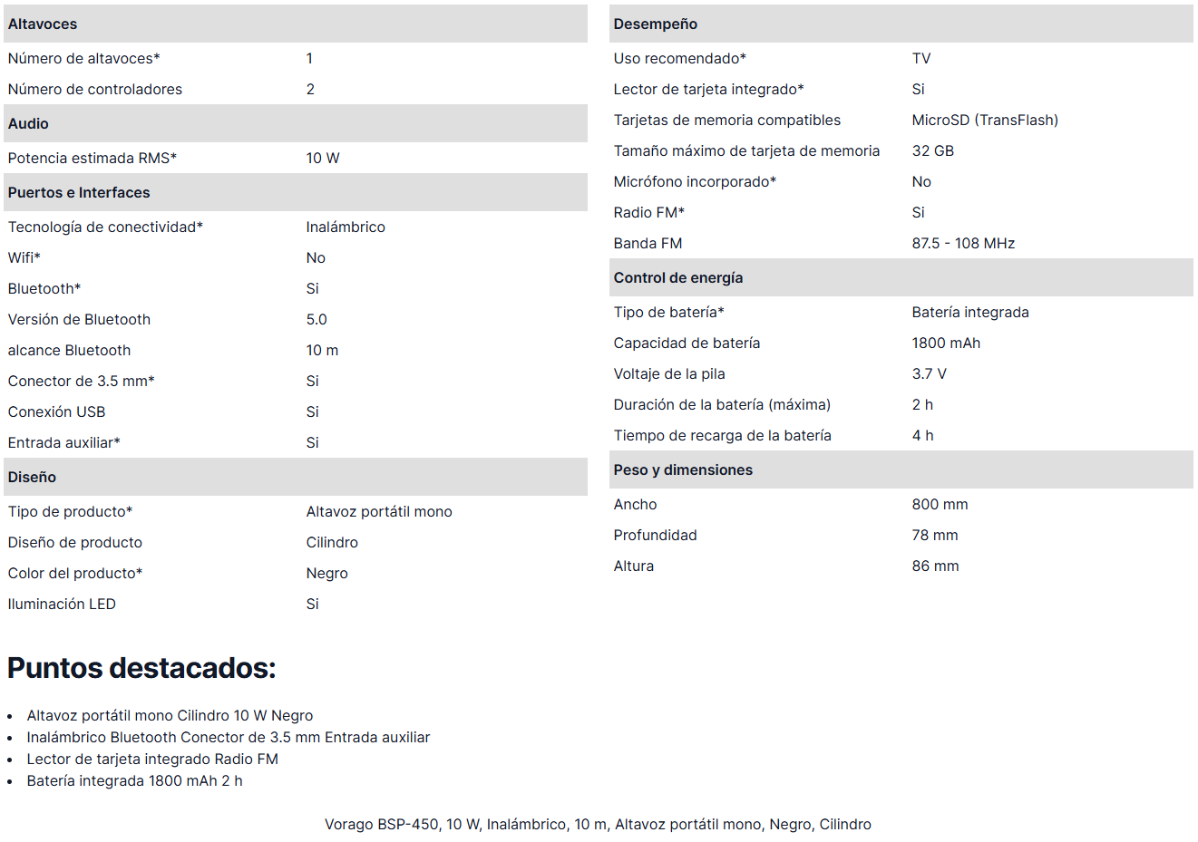 | Interfaz Bocina | Auxiliar o Memoria Usb o Micro SD o Usb Tipo C |