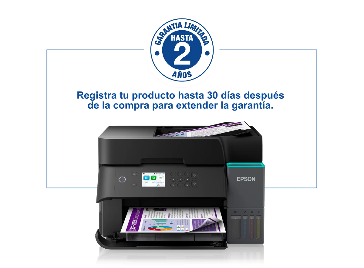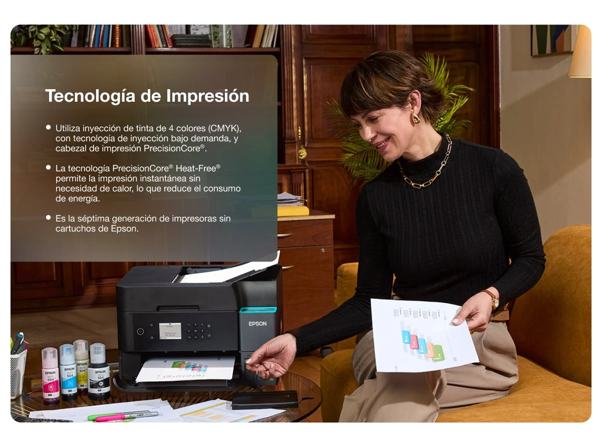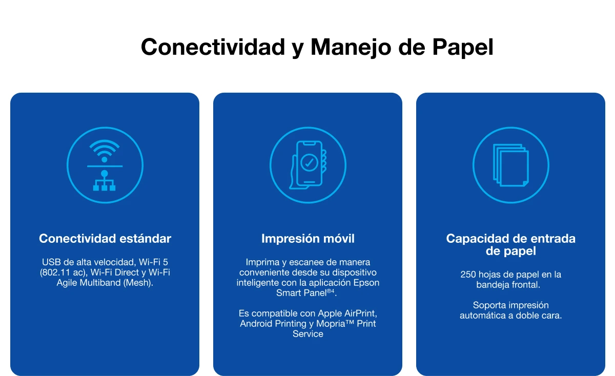 - Conéctate sin complicaciones: Wi-Fi dual band y Ethernet para una conexión estable y fácil impresión directa desde tu celular con la app Epson Smart Panel.