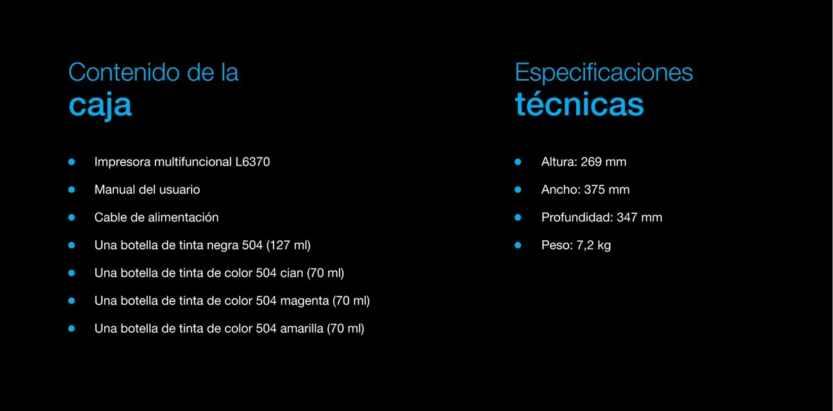 | Impresora multifuncional L6370, manual de usuario, cable de alimentación, 1 botella de tinta negra 504 (127 mL), y 1 botella 504 color cian, magenta y amarillo (70 mL)¹ | |