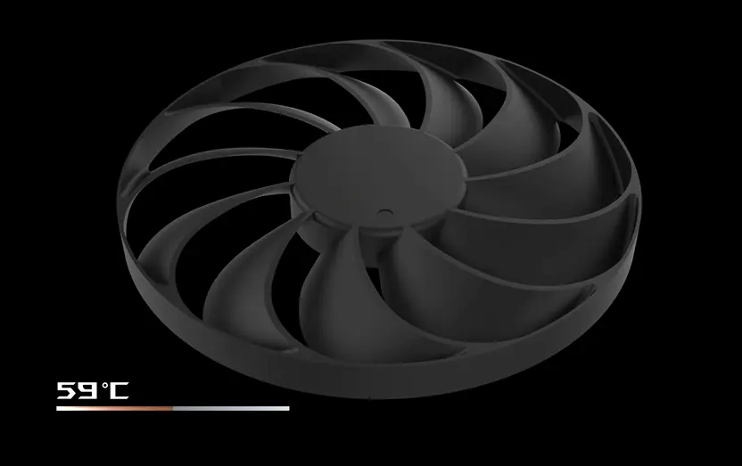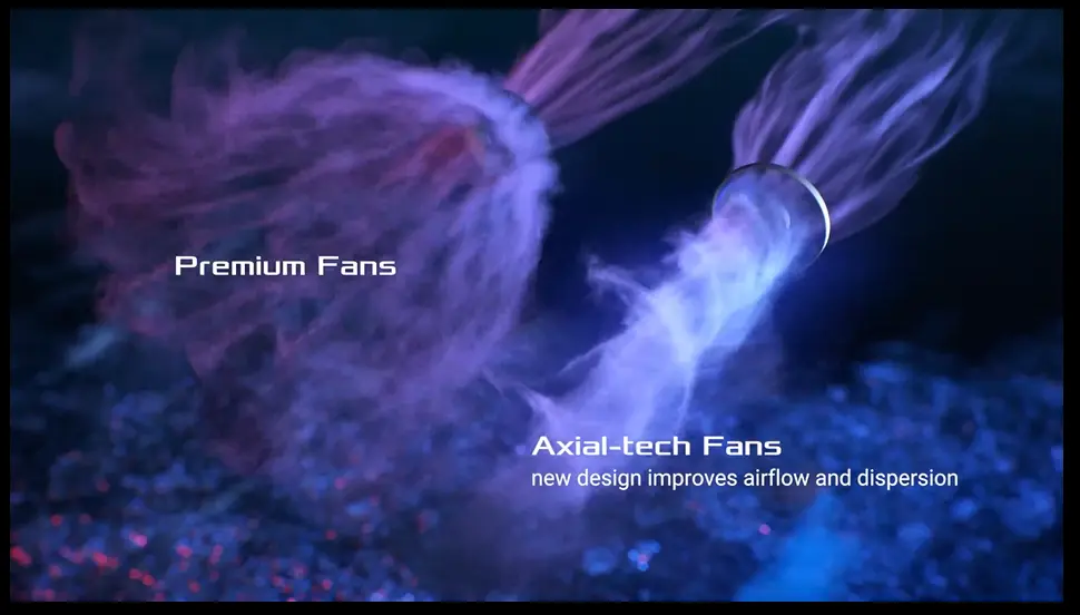 - El diseño de ventilador de Axial-tech presenta un eje de ventilador más pequeño que facilita aspas más largas y un anillo de barrera que aumenta la presión de aire hacia abajo.