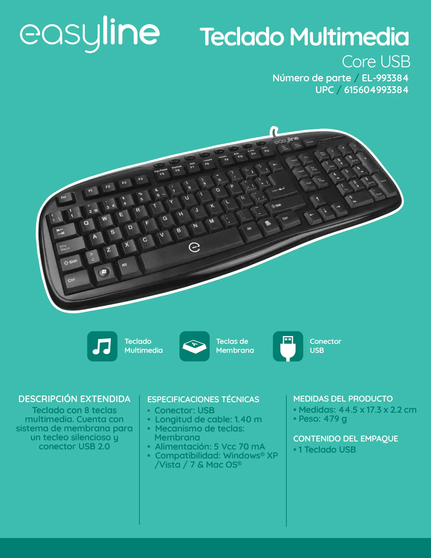 Teclado con 8 teclas multimedia. Cuenta con sistema de membrana para un tecleo silencioso y conector USB 2.0.