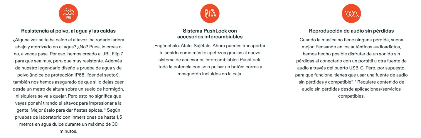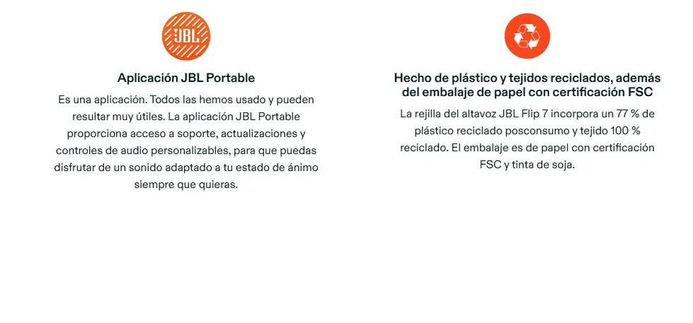 La banda sonora de tu vida, en la palma de la mano. El JBL Flip 7 ofrece el incomparable sonido JBL para que lo lleves contigo allá donde vayas. Porque la música no tiene límites y tú tampoco deberías tenerlos. Tanto si organizas una fiesta playera, estás relajándote en la terraza, como preparando el ambiente perfecto en casa, el Flip 7 mejora cualquier experiencia, dondequiera que nos lleve la vida. Y ahora, el famoso y exclusivo sonido JBL es más potente es también más impactante que nunca gracias al AI Sound Boost, también de JBL. ¿Y cuál es el resultado final? El Flip 7 dejará a todos tus amigos y familiares preguntándose de dónde sale ese sonido tan potente y definido. Pero es algo más, es mucho más que potente y bonito. El Flip 7 resiste los golpes sin perderse ningún matiz sonoro, además de contar con un grado de protección IP68, que indica que es resistente al agua, al polvo y a las caídas. Un líder en este sector. Además, con el nuevo Playtime Boost podrás disfrutar de hasta 16 horas de reproducción, para que seas tú quien decida cuándo parar. ¿Y no sería fantástico compartir el sonido JBL por todas partes? Pues ahora puedes hacerlo. Conéctate sin dificultades con otros altavoces JBL con Auracast™ para cubrir más espacio (y más oídos) con la misma lista de reproducción, tanto si estás recorriendo la ciudad con tu equipo ciclista como si llenas de punta a punta tu casa en tu próxima fiesta. En resumen, no es el típico altavoz portátil. Es todo un líder del sonido en un tamaño muy reducido.