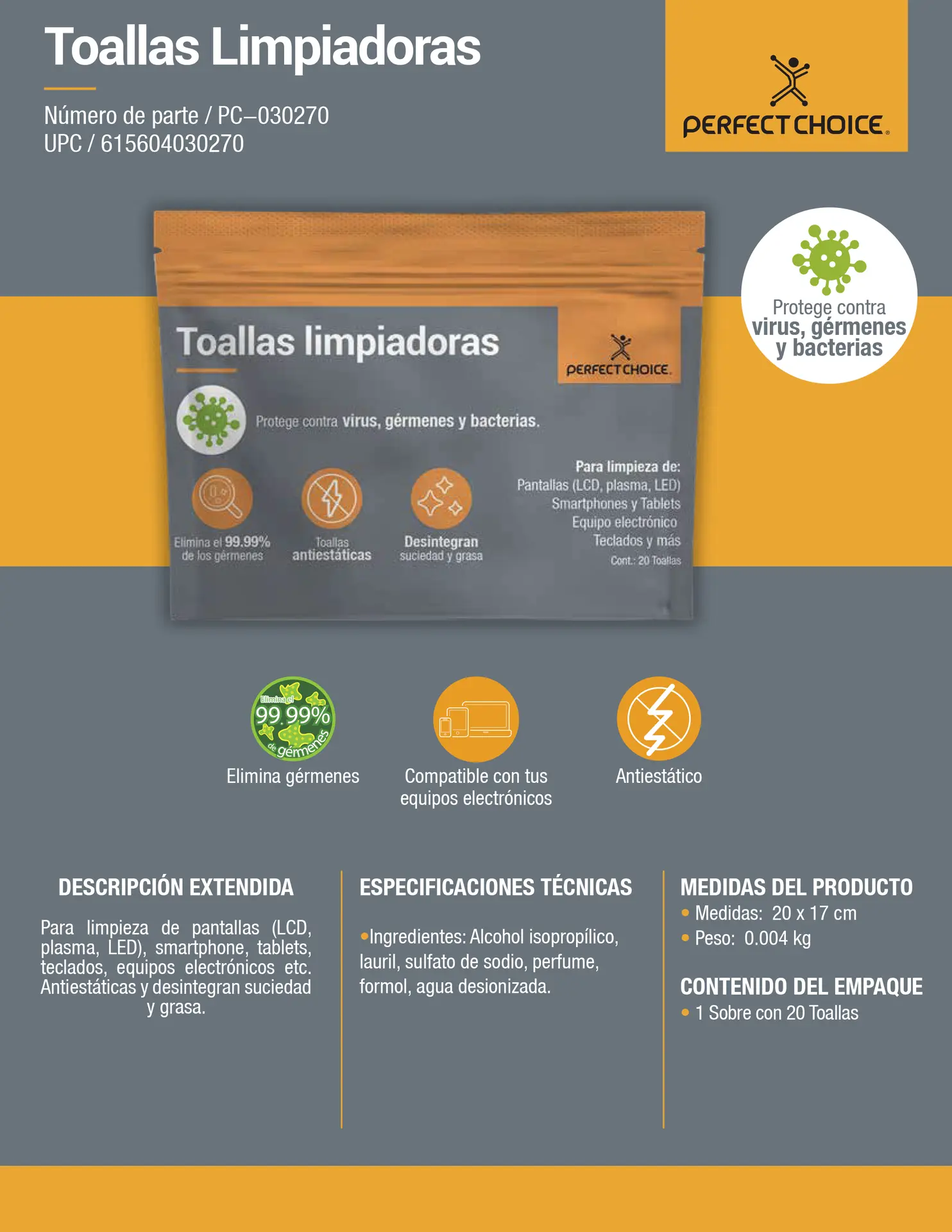 Perfect Choice Toallas Limpiadoras para Laptops y Pantallas PC-030270 CN-975 SKU: PC-030270