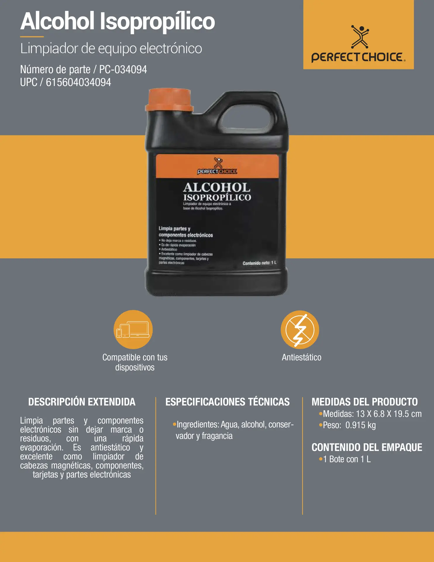 Perfect Choice Alcohol Limpiador 1 Litro PC-034124, Para Limpieza de Equipo Electrónico CN-2956 SKU: PC-034094