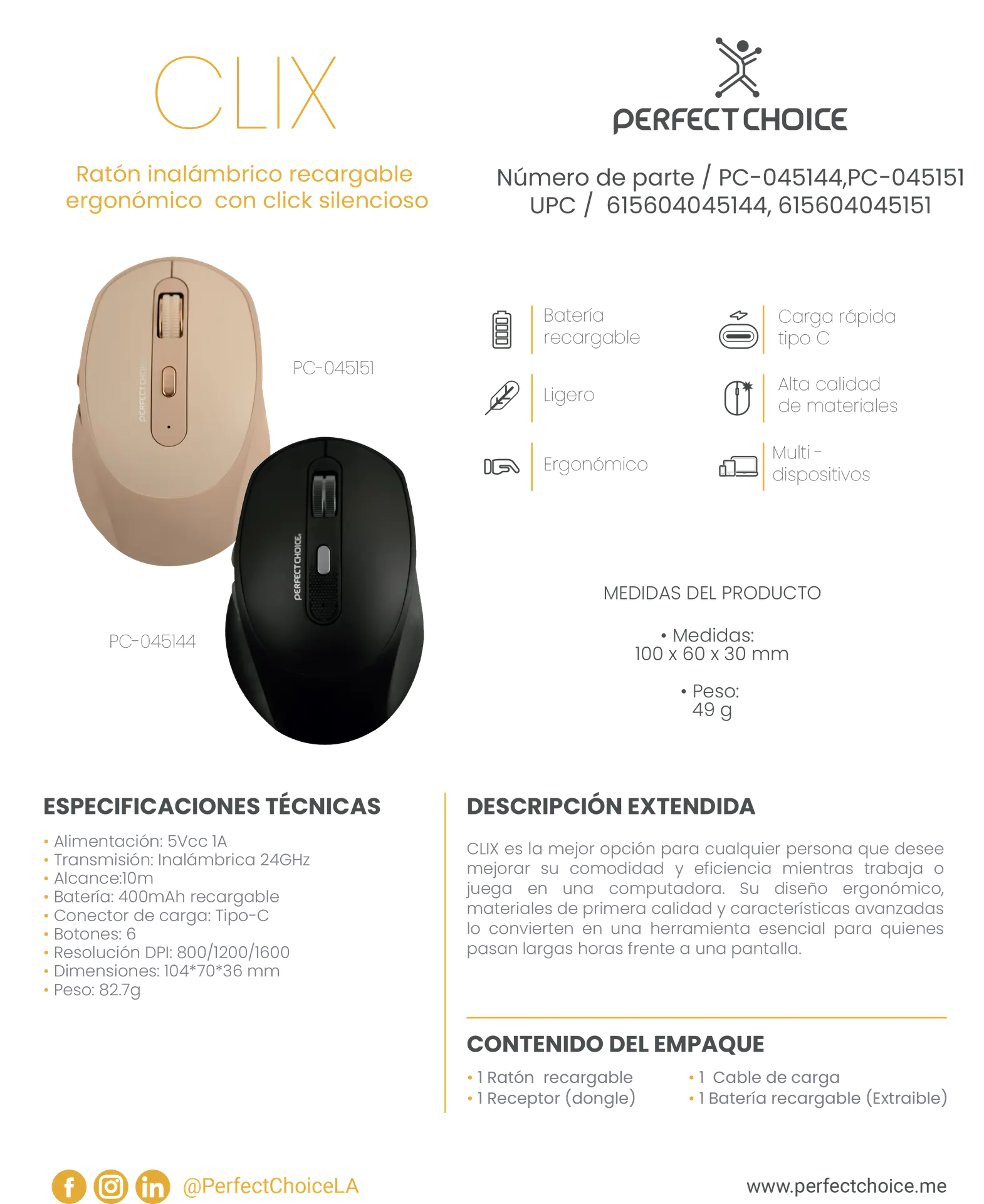 Mouse Perfect Choice Óptico, Inalámbrico, USB, 1600DPI, Caqui, Recargable Clic Silencioso Clix, MS-1580 SKU: PC-045151