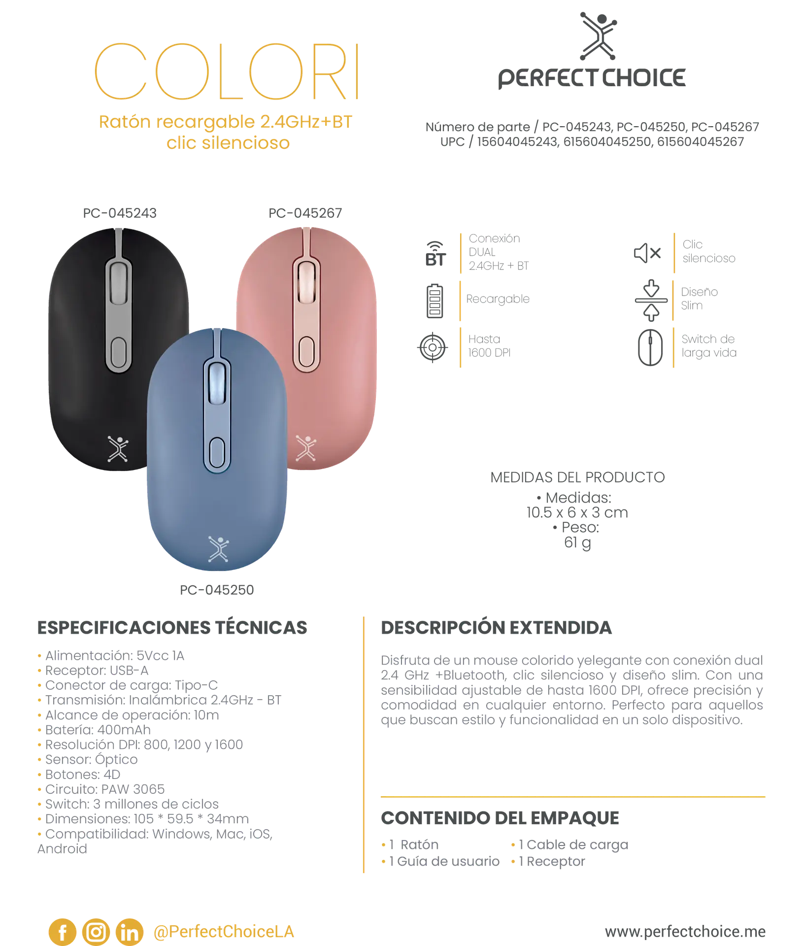 Mejora tu productividad con este ratón recargable que combina tecnología inalámbrica de 2,4 GHz y Bluetooth para una conexión fluida y sin interrupciones. Con clic silencioso y sensibilidad ajustable de hasta 1600 DPI.