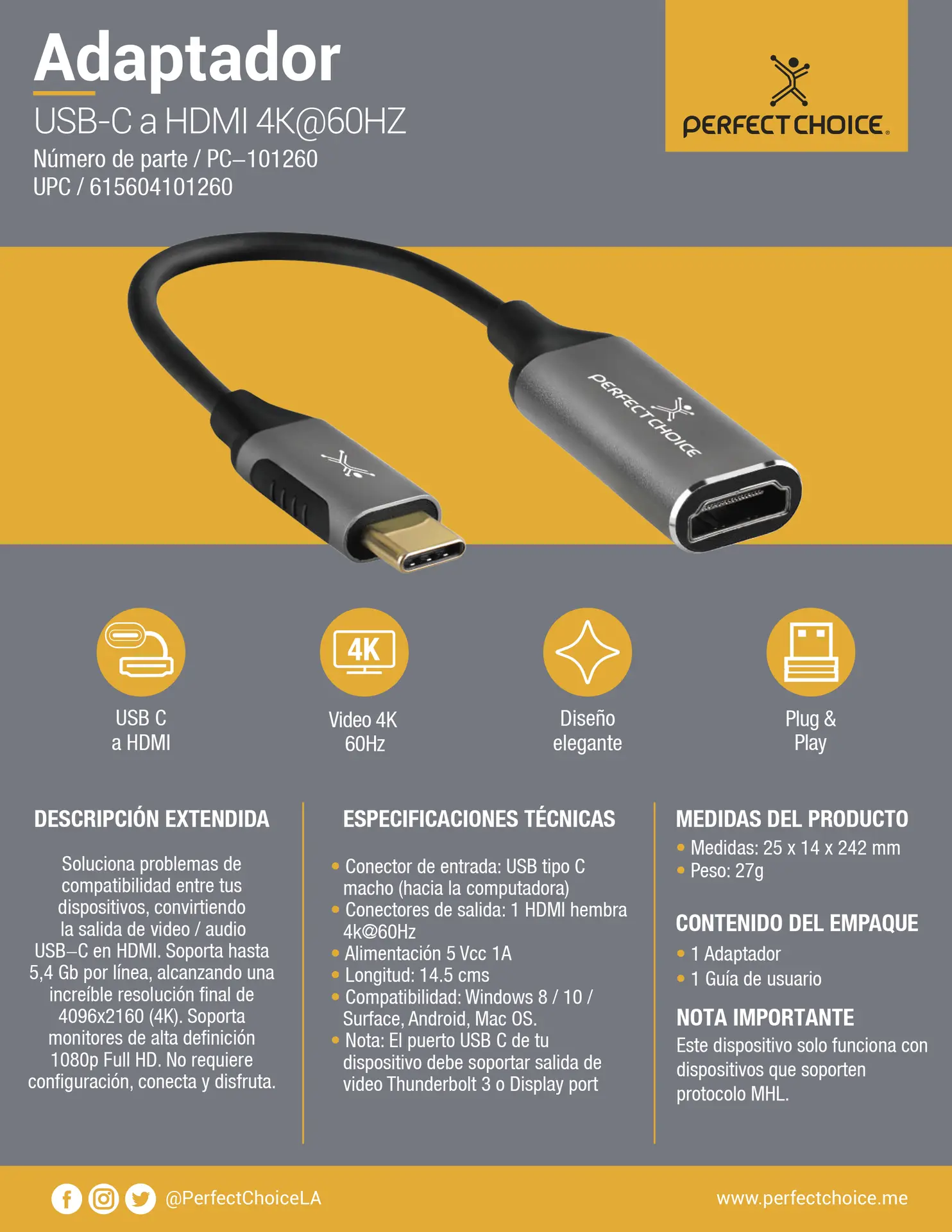 Perfect Choice Adaptador USB C Macho - HDMI Hembra, Negro 4K Full HD 14.5cm Plug & Play AC-9377 SKU: PC-101260