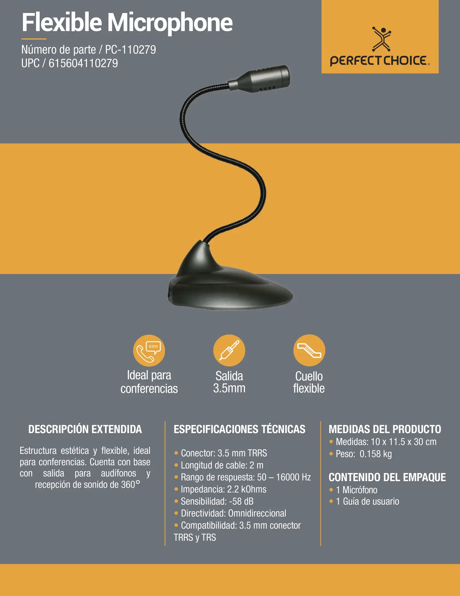 Perfect Choice Micrófono de Lujo con Cuello Flexible, PC-110279, Alámbrico, Negro, SPK-143 SKU: PC-110279