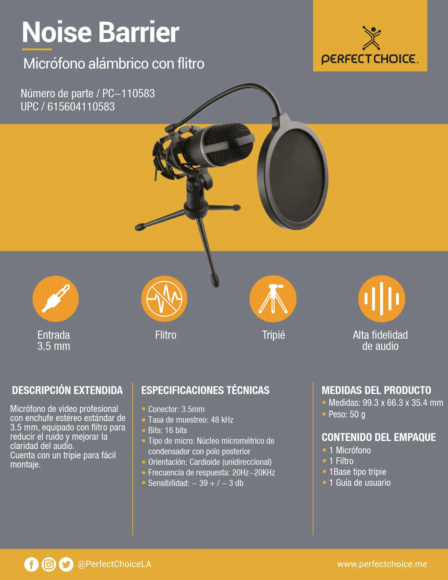 Perfect Choice Micrófono con Filtro Noise Barrier, Alámbrico, 3.5mm, Negro SPK-2175 SKU: PC-110583
