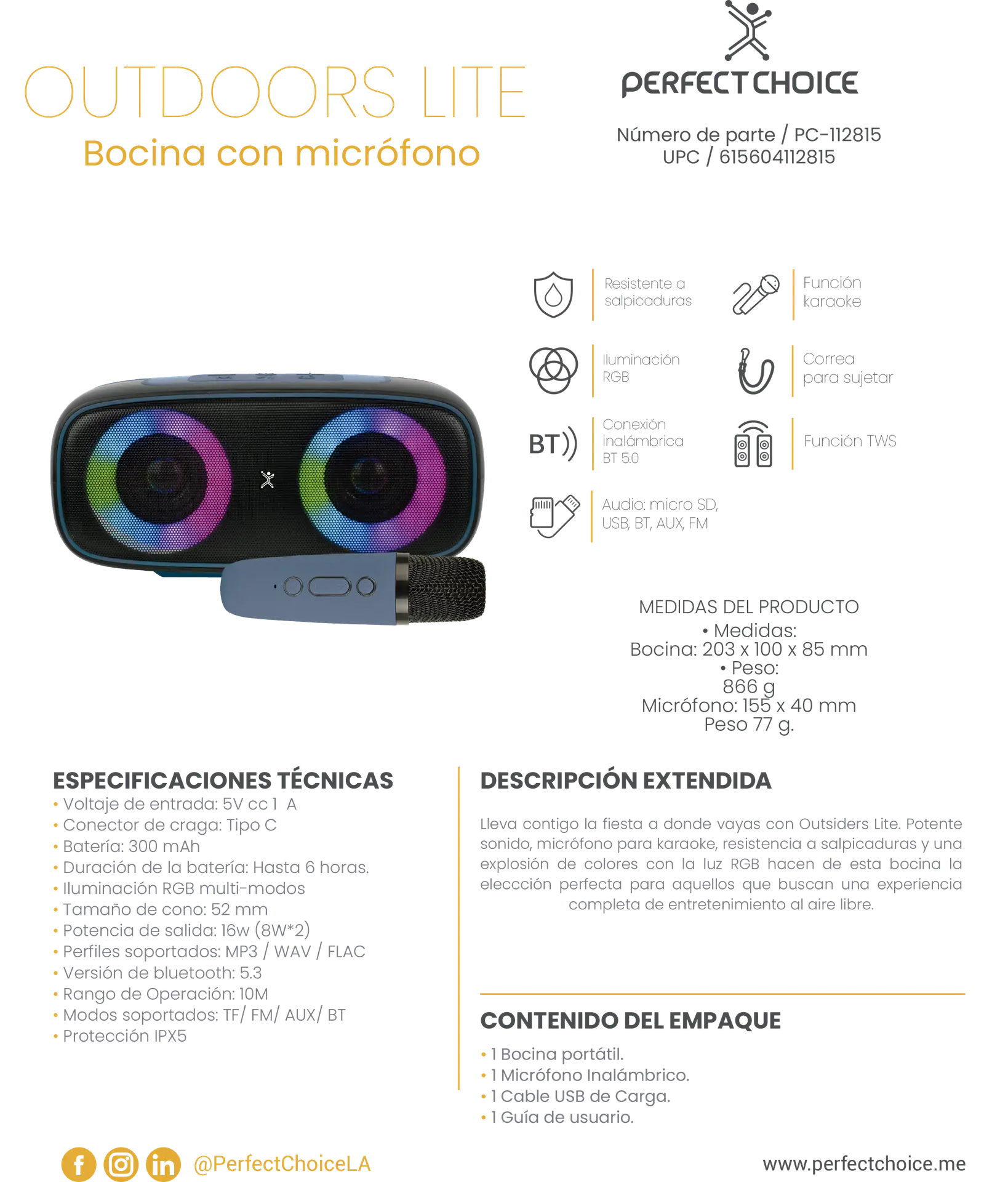 Lleva contigo la fiesta a donde vayas con Outsiders Lite. Potente sonido, micrófono para karaoke, resistencia a salpicaduras y una explosión de colores con la luz RGB hacen de esta bocina la eleccción perfecta para aquellos que buscan una experiencia completa de entretenimiento al aire libre.