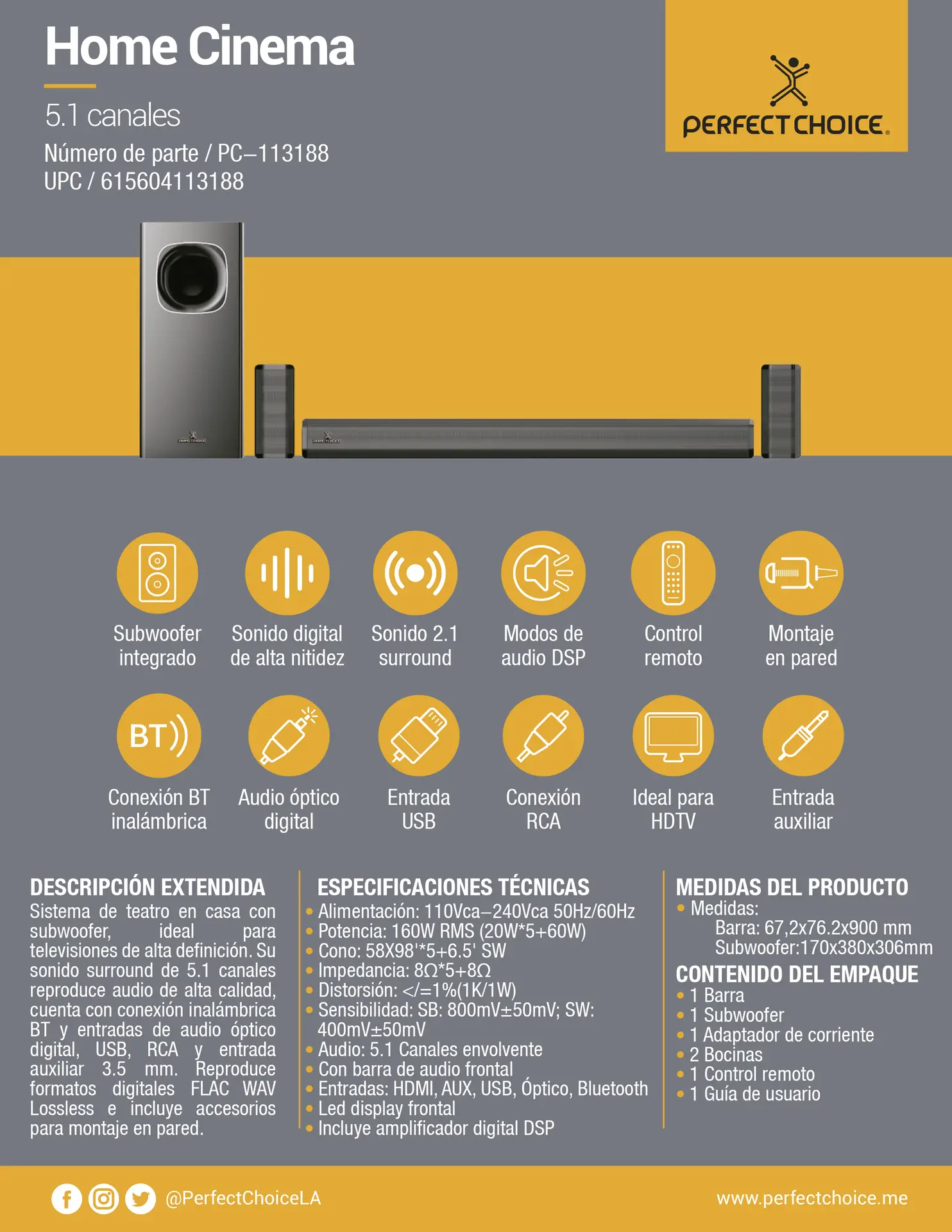 Sistema de teatro en casa con subwoofer, ideal para televisiones de alta definición. Su sonido surround de 5.1 canales reproduce audio de alta calidad, cuenta con conexión inalámbrica BT y entradas de audio óptico digital, USB, RCA y entrada auxiliar 3.5 mm. Reproduce formatos digitales FLAC WAV Lossless e incluye accesorios para montaje en pared.