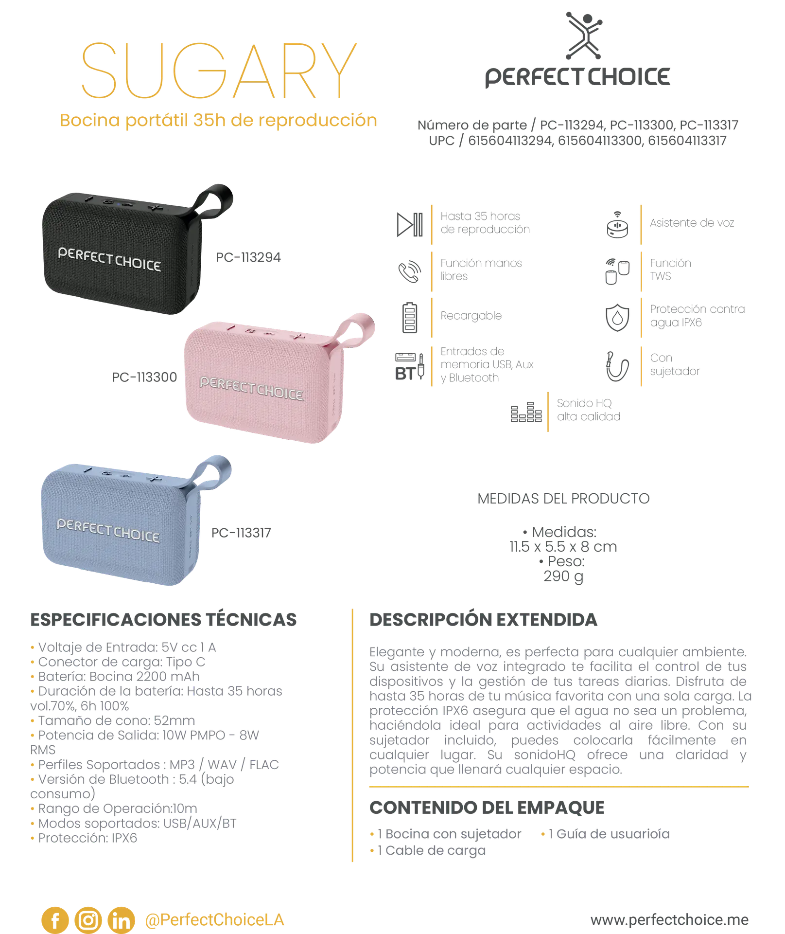 | Interfaz Bocina | Bluetooth o Memoria Usb o Micro SD o Usb Tipo C |