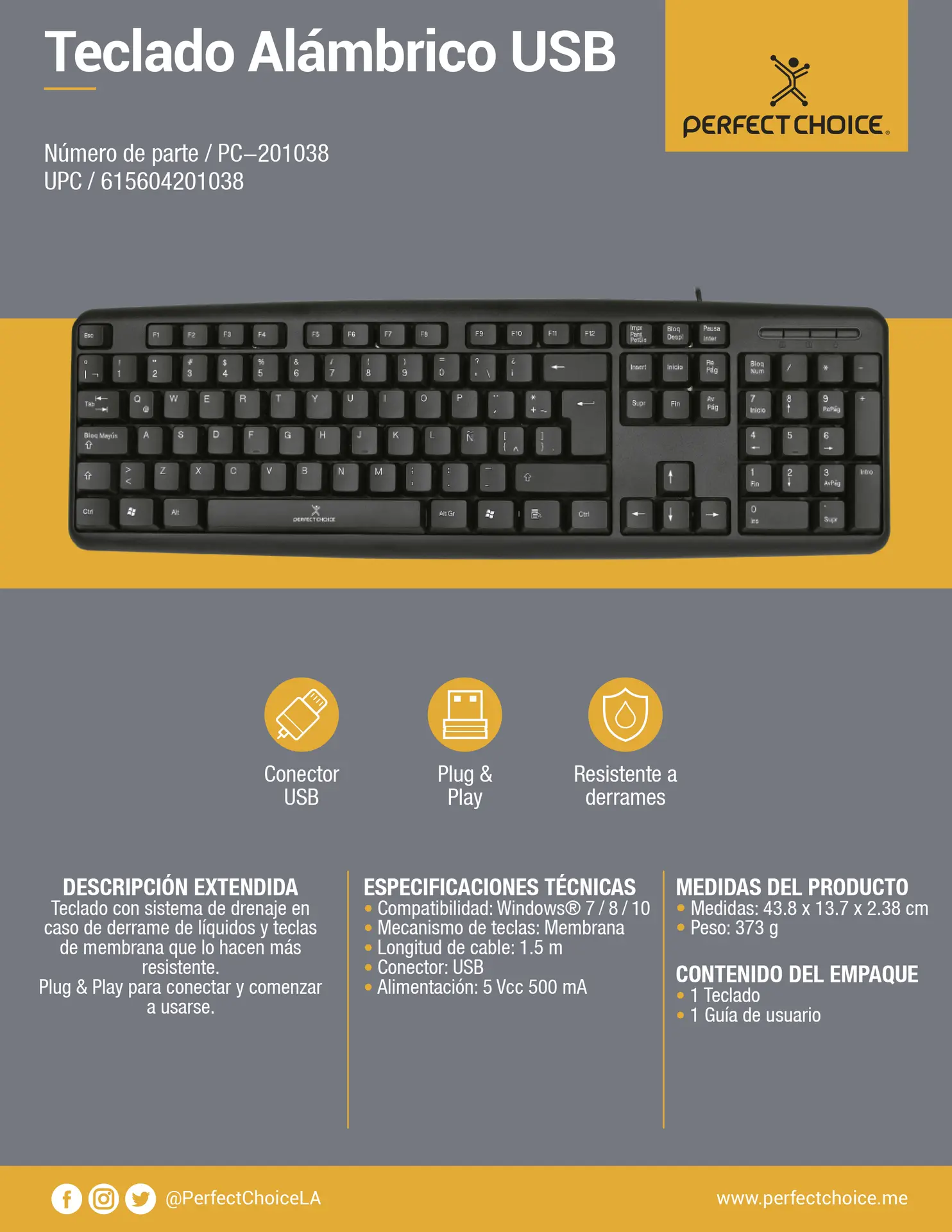 Teclado Perfect Choice, Alámbrico, USB (Español) KB-704 SKU: PC-201038
