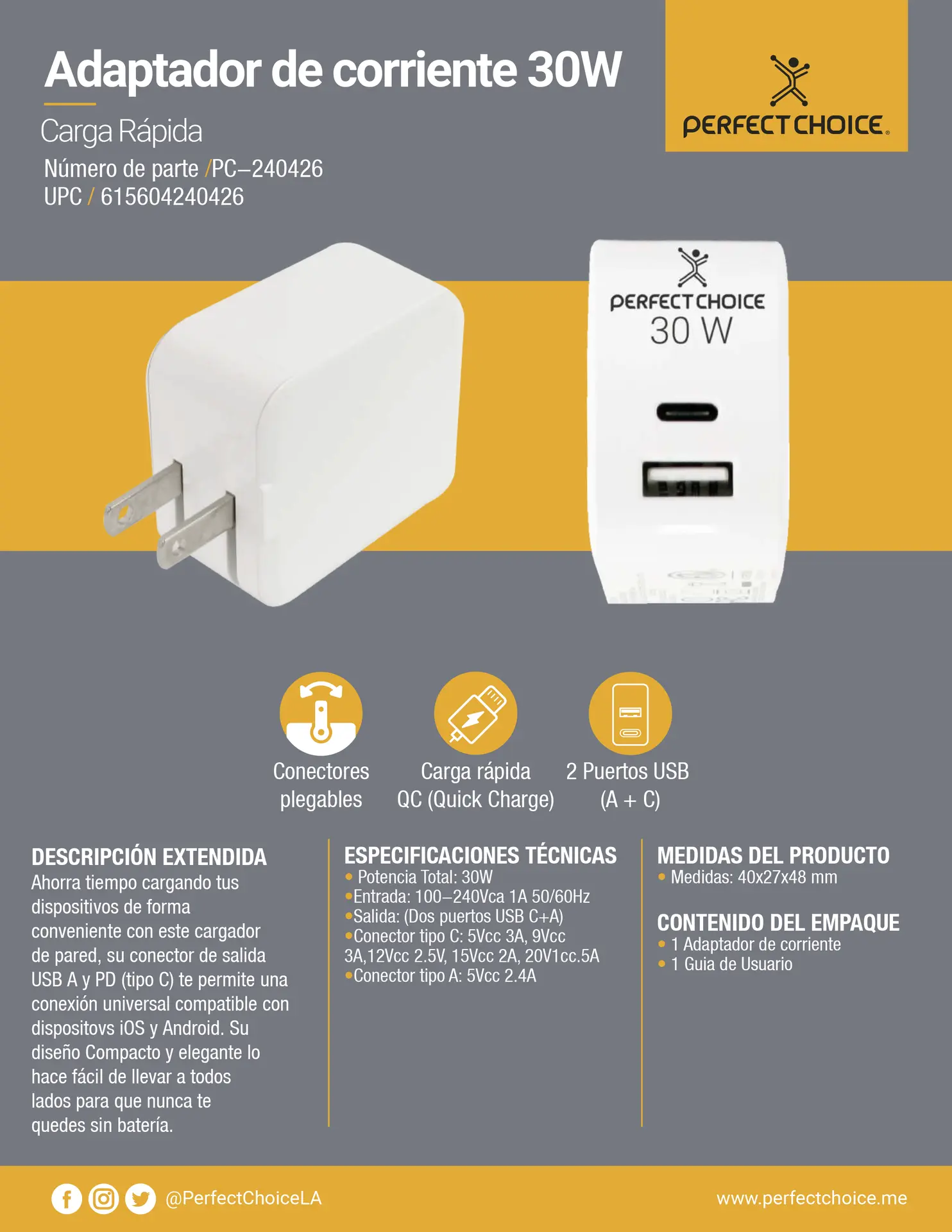 Perfect Choice Cargador de Pared, 30W, 1x USB-A/USB-C, Blanco AC-11438 SKU: PC-240426
