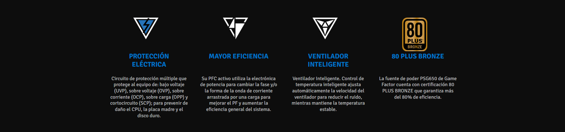 La PSG750 es una fuente de 750W con certificación 80 Plus Bronce, que asegura eficiencia energética y un rendimiento confiable gracias a sus capacitores 100% Japoneses que ayudan a alimentar correctamente todos los componentes de tu PC.