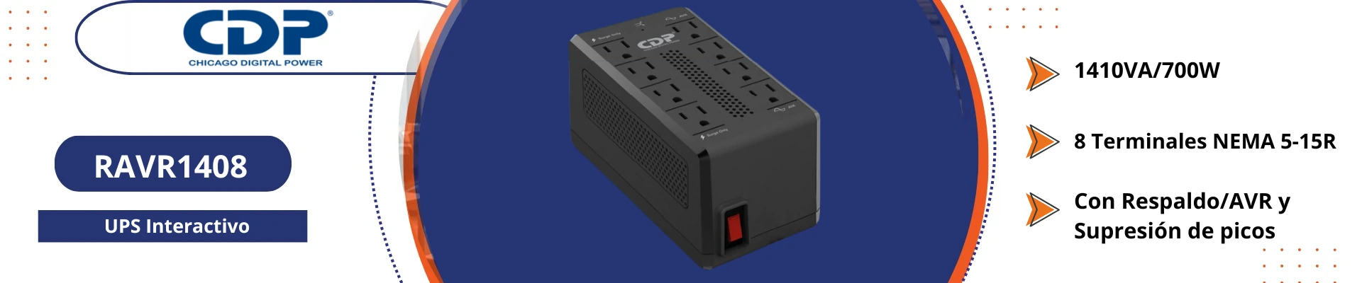 El RAVR1408 es un regulador automático de voltaje con supresión de picos, diseñado para proteger equipos electrónicos sensibles contra variaciones de tensión, sobrecargas y cortocircuitos. Su diseño compacto y funcional incluye múltiples tomas de corriente, breaker de protección, cable de entrada y orificios para montaje en pared.