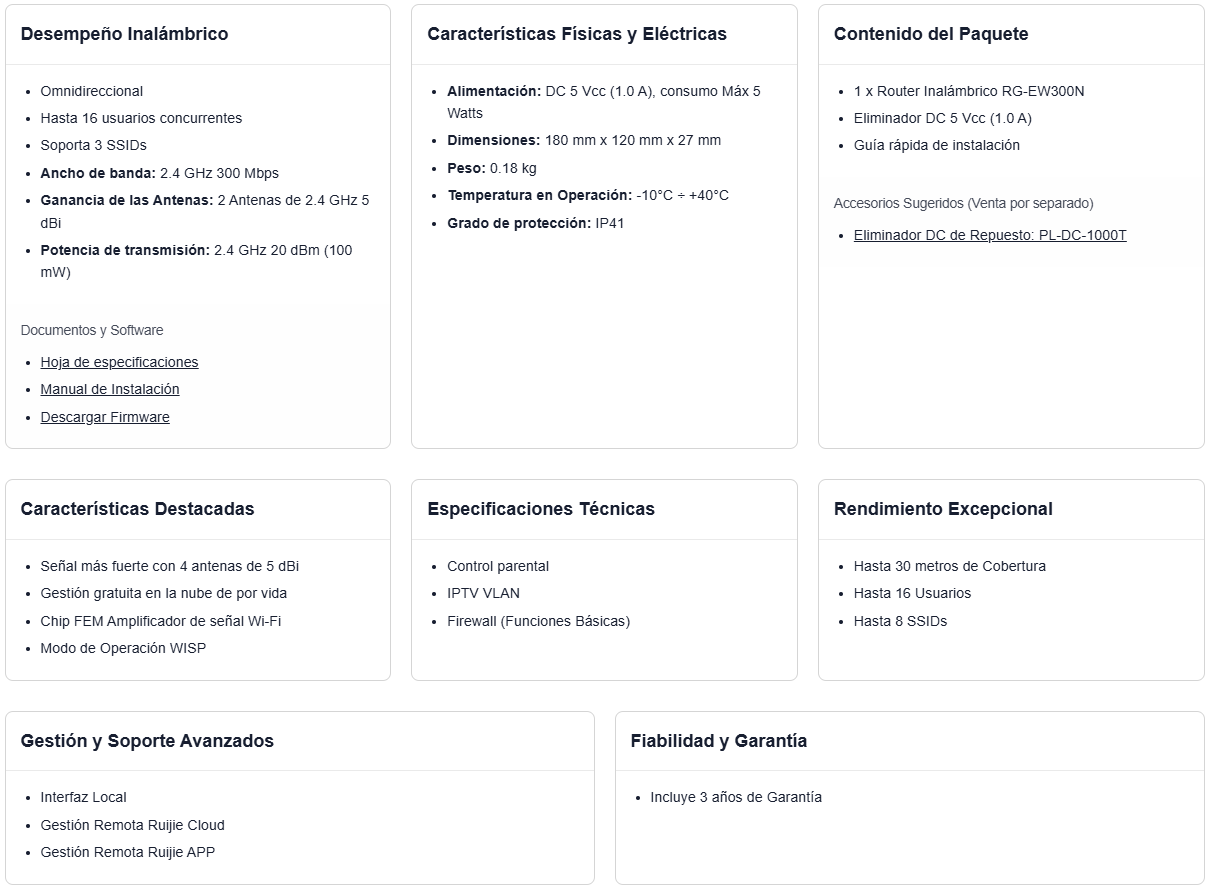 - Estándar: 802.11n (Wi-Fi 4). Soporta conexión de dispositivos de estándares anteriores