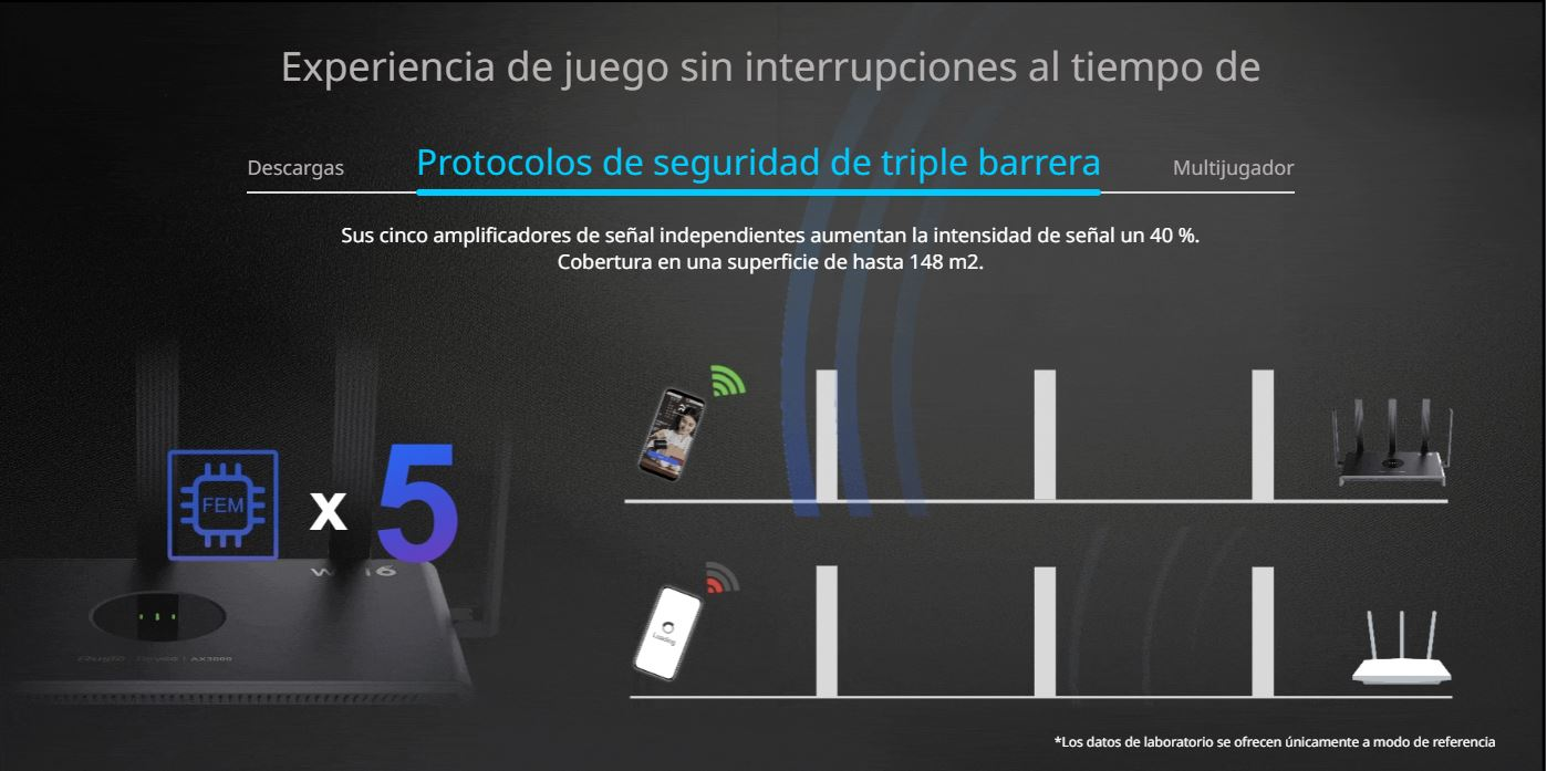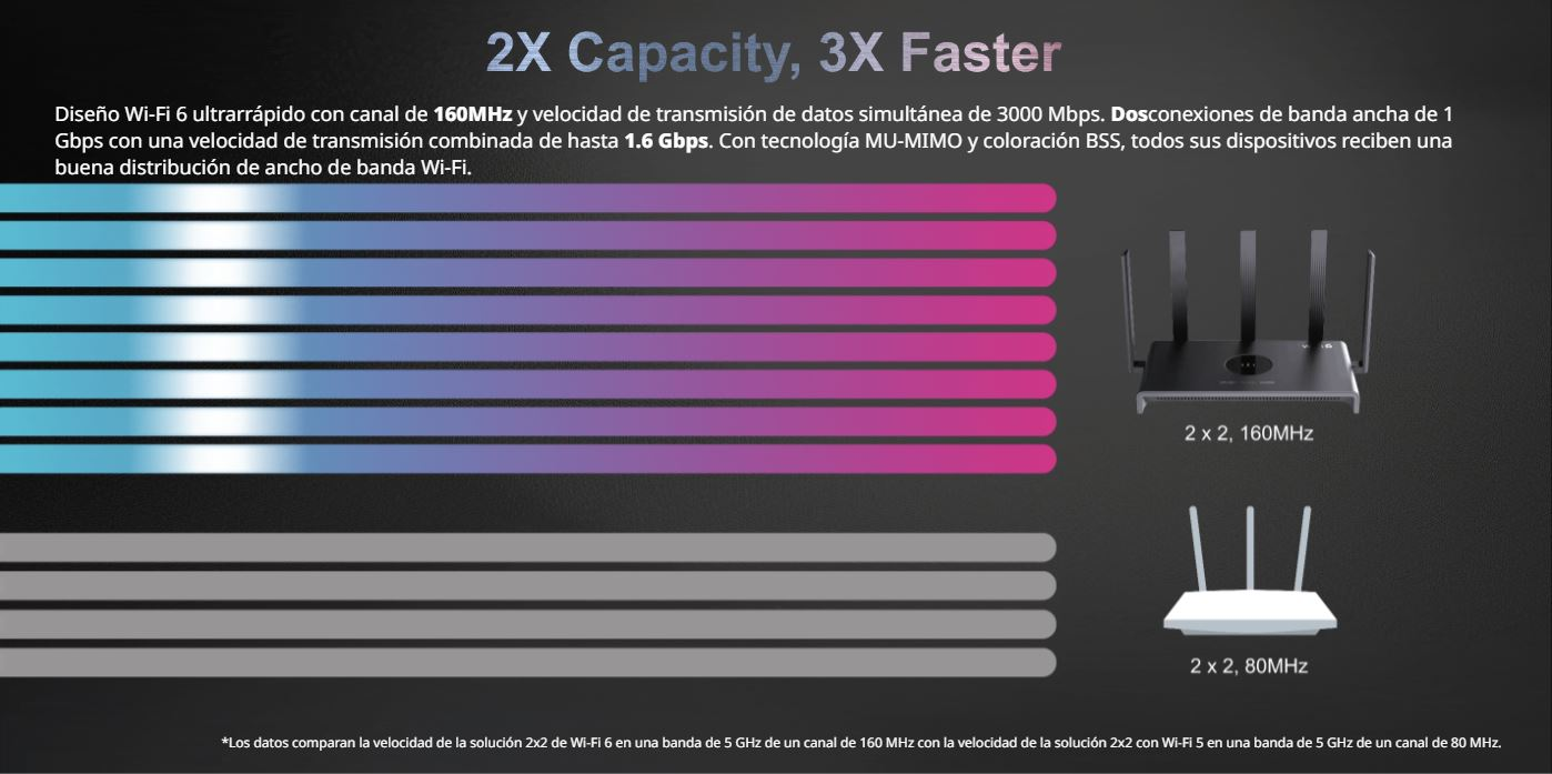 - Estándar: 802.11ax (Wi-Fi 6). Soporta conexión de dispositivos de estándares anteriores